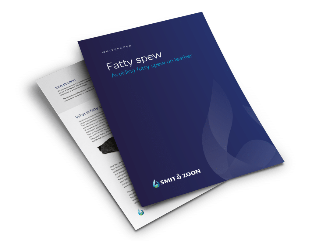 How to avoid fatty spew on leather? Download our free whitepaper on fatty spew and learn about its background, where it comes from, and what can be done to prevent its formation. On processed leathers it is sometimes observed that, over time, an undesired white milky film appears on top of the leather. This white layer often gives rise to debates on its origin and causes, and in some cases leads to a claim for damages. The phenomenon described is called ‘fatty spew’. The possible sources of fatty spew may be of diverse nature, they are similar in one respect. They always originate from high melting point substances. Download the whitepaper ‘Fatty Spew’ CommentsThis field is for validation purposes and should be left unchanged.My email address** First name**Last name**Company name**Stay informed Please keep me informed about the latest news on Royal Smit & Zoon and the leather industry.Consent* I have read and accepted the Terms & conditions and Privacy Statement. Δ What is fatty spew? All fats have a tendency to migrate through the leather when they are not irreversibly fixed to the matrix. Free saturated fatty acids, as all other substances, are sensitive to the influence of temperature. One of temperature’s effects is that it can change a substance’s appearance. The reason for the white layer on the grain is the high melting point, which is about 60°C to 70°C for all of the substances causing fatty spew. Below this temperature they begin to solidify but remain undetectable to the eye. Interesting for you Discover more on Wet End Renewable chemicals: replacing fossil-based by biobased ingredients What biobased materials can be used to replace petrochemicals? Discover our alternatives and criteria. A Perfect Model of Circularity: Return To Nature collection by Anya Hindmarch Fashion game-changer Anya Hindmarch has created a leather bag collection that can decompose back to earth. The bags have been designed to be capable of degrading naturally – from earth, to cow, to bag, to earth and on again in a model of perfect circularity. Certifications for safer chemistry you should know about How to source sustainable materials? Asking for the right certifications helps. For the leather supply chain there are 4 certification every brand should know of. Wet End Discover Stay informed Receive the latest company news and industry updates Subscribe Share this: