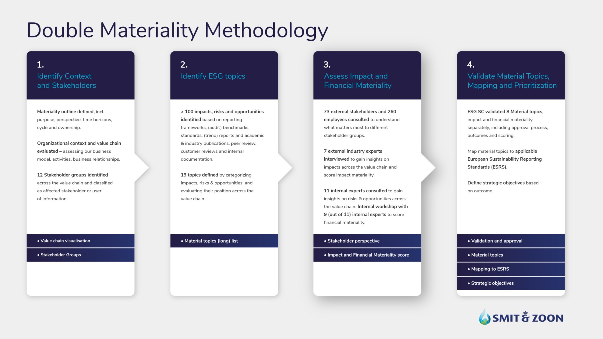 Every year, Royal Smit & Zoon publishes their ESG report. What is the process behind it and why is ESG so important? Aukje Berden, ESG Director of Royal Smit & Zoon, explains more about this topic. What does ESG mean to Royal Smit & Zoon? To us, ESG means being a world-class, internationally recognized, responsible manufacturer, while continuously improving the footprint of our own operations and our business activities across our value chain, delivering sustainable solutions driven by innovation, and driving industry transformation by demonstrating thought leadership and being a catalyst in creating a more sustainable leather value chain. As a 7th generation family business, it is evident that we are in it for the long run. Compared to most of our competitors, ESG therefore has a much more prominent role in our company strategy, because it has a direct link to future generations. We want to create a leather industry that is not only here today, but also for the generations to come! This makes our mission – to create a socially and environmentally sustainable leather value chain, together – not just loose words, but something that is part of our DNA and lived upon in our daily business. Especially the “together’ part of our mission we consider crucial, as the key to progress lies in collaboration with our partners and stakeholders. What role does the ESG report play in your ESG strategy? Our ESG report is about ‘walking the talk’: a tangible result of our efforts, impacts, progress, ambitions and challenges! It is a key means in fulfilling our mission as it provides transparency and accountability regarding our ESG performance. That also makes it an important tool for stakeholders – employees, customers, suppliers and regulators – to understand and share our practices and challenges in managing our ESG impact. But our ESG report should be considered a step in a much bigger journey of ongoing sustainable business transformation and making the leather value chain more sustainable. That is what matters most. And it all starts with the drops contributed by everyone at Royal Smit & Zoon. Without that, of course, you cannot make progress and a report! Who do you make an ESG report for? It is compulsory? Making an ESG or Sustainability report is not compulsory yet for Royal Smit & Zoon, but we consider it common good practice to publish such a report and be transparent about how you approach and manage your impact on the environment and people. You have just launched the 2023 ESG report. What was the biggest challenge in 2023? One of the biggest challenges was also one of the biggest achievements, namely the execution of our Double Materiality assessment, a crucial step in anticipating and addressing the requirements of the Corporate Sustainability Reporting Directive (CSRD).). We engaged 333 stakeholders across our value chain for this exercise. It was a huge exercise, but above all it was very rewarding, valuable and insightful! My sincere thanks to everyone who contributed to this effort! Understanding the perspectives and needs of our stakeholders enable us to understand what is important to them and to improve our collaboration and create sustainable impact in the leather value chain. With the insights, we can now pinpoint strategic priorities for the upcoming years. Double materiality means that you assess what material impacts the company has on the environment and people across its value chain and reversely, what ESG related impacts, risks and opportunities across the value chain may impact (the financial performance) of the company. We worked together with 2Impact Consulting on our double materiality assessment. And what are you most proud of to have achieved? Our EcoVadis Platinum rating. We consider it a good reflection of our leading sustainability performance, commitment, progress, efforts and impacts in creating a sustainable leather value chain as it covers many different areas (Environment, Human and Labor Rights, Ethics and Procurement) and many different layers (policies, actions, results (metrics) and targets). Coming from Gold in the past 2 years, it really demonstrates how committed we are to ongoing improvements. In the spirit of our mission, we want to continue to raise the bar in terms of sustainability, while collaborating for a future-proof leather industry. I am most proud of all contributions made by everyone: Our Ecovadis Platinum rating is a collective effort and ESG a joint journey. It is truly integrated in our DNA and at the heart of what we do at Royal Smit & Zoon. Focus on 2024: what are your goals? We want to maintain our ambition as sustainability leader and we will advance our ESG Strategy throughout 2024 by developing our current ESG Roadmap 2025 into an enhanced ESG Strategy 2030. This updated strategy should address global sustainability challenges and reflect our commitment to continuous improvement in aligning our activities with our mission. We want to make sure that ESG remains at the core of our strategy and is truly lived upon. Above all, we are keen to act and deliver on it as it is critical to ensuring continuity for our family-owned business and future-proof leather industry. At the same time, we recognize the importance of robust data to substantiate our achievements and aspirations. Of course, we cannot do this alone: every drop counts and the key to progress lies in collaboration with all our stakeholders! ESG and sustainability are truly integrated in our DNA and at the heart of what we do at Royal Smit & Zoon. Have a look at our ESG Report View report Interesting for you Discover more news Royal Smit & Zoon presents 2024 ESG Report Leather chemicals manufacturer Royal Smit & Zoon publishes its 11 th annual ESG Report, highlighting the company’s progress, solutions, and ambitions in creating a sustainable leather value chain, together. Royal Smit & Zoon presents 2021 ESG Report Leather chemicals manufacturer Royal Smit & Zo