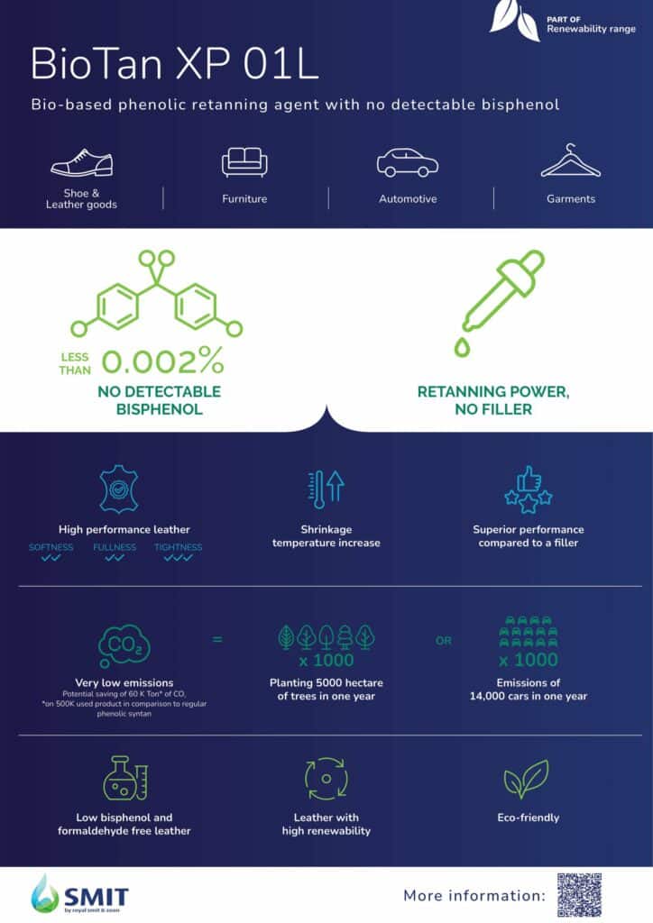 Bisphenols have become an important topic of discussion in the leather industry, especially since the restriction proposal of the European Chemicals Agency on bisphenols. To meet regulations and to hold on to our mission statement, to create a sustainable leather value chain, our subisidairy Smit has developed a special range of wet end solutions optimized on bisphenols for high quality leather. We offer syntans with low bisphenol values and introduce BioTan XP 01L, an innovative retanning agent with no detectable bisphenol. All our bisphenol optimized solutions are thoroughly tested, both on performance and on bisphenol limits. Download brochure The future of retanning is now, with BioTan XP 01L. Imagine retanning of the future; low emissions, bio-based ingredients and free of bisphenol and formaldehyde. With the power of a traditional phenolic retanning agent and no compromise on the performance, fullness and softness of the leather BioTan XP 01L offers just that. No detectable bisphenol. With tanning power. BioTan XP 01L is the latest innovation of Smit wet end and part of their recently launched Renewability range. An innovative phenolic retanning agent that is partly bio-based. It’s not a blend and not a filler. It is your next step in meeting the demand for low emissions and to build further towards a sustainable way of leather making. No detectable bisphenol values Multiple independent test results confirm this: bisphenol-F and bisphenol-S values are always below detection limit in BioTan XP 01L. On leather, so on Zeo White or wet blue retanned with BioTan XP 01L, analyses also show bisphenol values below detection limits on BPS, BPF, BPA, BPB. The main benefits of BioTan XP 01L: Tanning power, no filler Bio-based polymer produced by patented technology No detectable bisphenol Free of formaldehyde Very low emission values BioTan XP 01L gives you sustainable future-proof retanning without compromises on leather performance. Like no other retanning agent does. More information? Request the TDS Phenol-based, low bisphenol retanning solutions Download our brochure with bisphenol low retanning solutions Download pdf here Interesting for you Discover more news PMLS: showcasing low-bishpenol and Optitan in Pakistan Royal Smit & Zoon Zoon agent Badr Alam Trade Pakistan will be present at the PMLS exhibition from January 26-28, 2025. Smit expands range of sustainable Wet-end chemicals The launch of these products contributes to Royal Smit & Zoon’s mission, to create a more sustainable leather value chain, by using more bio-based products and lower emission rates. Royal Smit & Zoon presents 2024 ESG Report Leather chemicals manufacturer Royal Smit & Zoon publishes its 11 th annual ESG Report, highlighting the company’s progress, solutions, and ambitions in creating a sustainable leather value chain, together. More news Go to all news articles Discover Stay informed Receive the latest company news and industry updates Subscribe to our newsletter Share this: